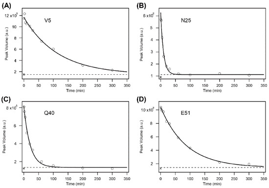 The H/D-exchange curves for Val5 (V5) (A), Asn25 (N25) (B), Gln40 (Q40) (C), and Glu51 (E51) (D) of human ubiquitin in 6 M GdmCl at pH* 3.3 and 15 °C. The solid lines are the theoretical curves best fitted to a single-exponential function (Equation (4)). A broken line in each panel indicates the theoretically estimated peak volume after the complete exchange (i.e., Y(∞) in Equation (4)), and an asterisk “*” in each panel, located between (1–2) × 108 of the peak volume, indicates the experimentally observed value after heating the sample at 50 °C for 30 min. Because the reaction mixtures contained 10% H2O, the final peak volumes did not reach zero. The kobs values for the four residues are: (A) (8.7 ± 0.8) × 10−3 min−1; (B) (10.5 ± 1.2) × 10−2 min−1; (C) (4.6 ± 0.4) × 10−2 min−1; (D) (1.2 ± 0.1) × 10−2 min−1. The first and last time points are at 0.62 and 300.09 min, respectively, for all panels. Adapted with permission from Ref. [136]. Copyright 2020 Biophysical Society.