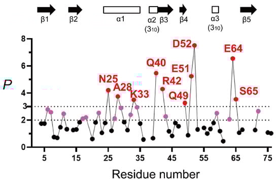 From Figure 4, a majority of the NH protons have a P value below 2 and larger than or equal to 0.8, indicating that these peptide NH protons are almost fully exposed to solvent water in 6 M GdmCl. This is consistent with the previous reports that ubiquitin in concentrated denaturant (6 M GdmCl or 8 M urea) at acidic pH is almost fully unfolded [155,167,168,169,170]. However, the 10 NH protons of Asn25, Ala28, Lys33, Gln40, Arg42, Gln49, Glu51, Asp52, Glu64, and Ser65 were significantly protected with a p value larger than 3, and the additional 14 NH protons of Lys6, Thr7, Lys11, Val17, Glu18, Thr22, Lys27, Lys29, Asp32, Glu34, Leu43, Tyr59, Lys63, and Arg72 showed p values between 2 and 3. These results thus clearly indicate the presence of residual structures in unfolded ubiquitin. Because the protein was unfolded in 6 M GdmCl, it is most likely that these residues were protected by the formation of an H-bond with a certain acceptor group.