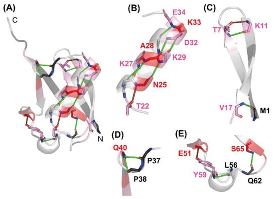 The H-bonding network observed in native ubiquitin (PDB code: 1UBQ). (A) A whole view, and (B–E) closer views of (B) the middle α-helix, (C) the N-terminal β-hairpin, (D) the one-turn 310 helix (Pro38–Gln40), and (E) the Type II β-turn (Gln62–Ser65) and the one-turn 310 helix (Ser57–Tyr59) are shown. The H-bonds of the NH protons of Thr7, Val17, Lys27, Ala28, Lys29, Asp32, Lys33, Glu34, Gln40, Tyr59, and Ser65 with the CO groups of their counterparts are shown as green lines. The local H-bonds formed by the NH protons of Lys11, Asn25, and Glu51 with the side-chain atoms of Thr7, Thr22, and Tyr59, respectively, are shown as brown lines. The red gradient indicates the same P value scale as shown in Figure 2. Adapted with permission from Ref. [136]. Copyright 2020 Biophysical Society.