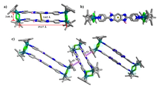 (a) Crystallographically determined molecular structure of the main cation of complex 1 and the π−π accumulation effect (3.62 Å) in 1; (b) top view of 1; (c) accumulation pattern of compound 1 and π−π intermolecular interaction (3.55 and 3.51 Å). All hydrogen atoms were omitted for clarity (N—blue; C—gray; Rh—Aqua; Cl—green).
