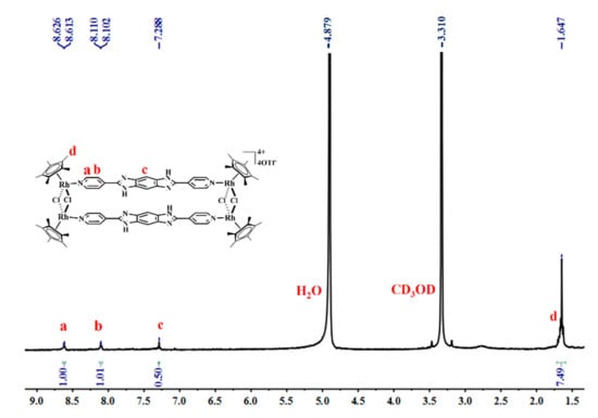 The presence of compound 1 in solution was also determined by the 1H NMR spectra (Figure 2), along with the combination of 1H−1H COSY NMR and 1H−1H DOSY NMR spectra (Figure 3a). In complex 1, two obvious double peaks could be observed in 8.20 and 8.11 ppm, which could be attributed to two pyridine protons of ligand L1. Meanwhile, a strong singlet could be found in 7.29 ppm, belonging to phenyl protons of ligand L1. Moreover, the peak of the Cp* group proton was located at 1.65 ppm. The 1H diffusion-ordered spectroscopy (DOSY) NMR spectrum of 1 clearly indicated that these signals for the aromatic and Cp* units showed a single diffusion coefficient (2.38 × 10−10 m2s−1), further confirming stable presence of structure 1 (Figure 3b).