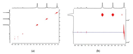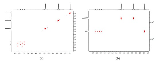 Moreover, the solution behavior of solid complex was also important for the various performance studies. Therefore, the solution characterization of complex 2 was also explored via the 1H NMR spectra accompanied by the two-dimensional spectra of 1H-1H COSY NMR and 1H-1H DOSY NMR (Figure 6 and Figure 7). Similarly, compared with that of complex 1, two obvious multiple peaks 8.18–8.17, 7.64–7.62 ppm bearing clear coupling interaction can be observed in complex 2, which belongs to the phenyl protons of E2 building units. In addition, the signals of two pyridine and one phenyl proton of ligand L1 could be found in 7.87, 7.39, 7.08 ppm, which is pretty close to that in complex 1, albeit with a slight offset. The chemical shift of Cp* proton is at 1.92 ppm. Finally, a single diffusion coefficient from the 1H-1H DOSY NMR spectrum (2.45 × 10−10 m2s−1) clearly demonstrated the presence of complex 2 (Figure 7b).