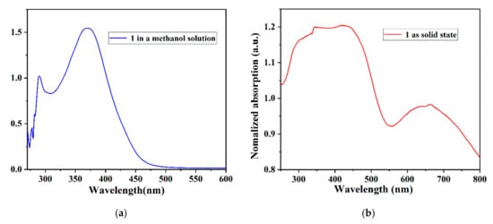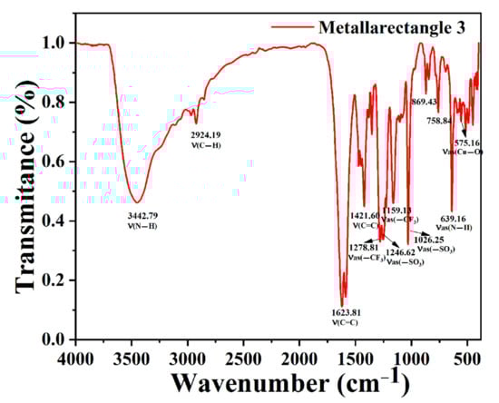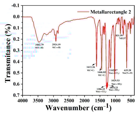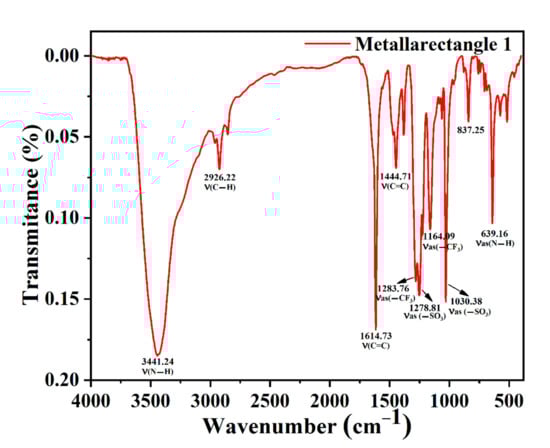 Moreover, the results of IR spectrum of complex 1 exhibits a strong band at 3441 cm−1 owing to the stretching vibration of the N-H bond of imidazole group [,,], the peaks at 1030 and 1279 are likely the asymmetric and symmetric sulfonate stretches and the peaks at 1160 are due to CF3 asymmetric and symmetric stretches [,,]. The peaks at 1614 and 1444 are likely attributed to the vibration of aromatic ring structures of ligand L1 (Figure 4).
