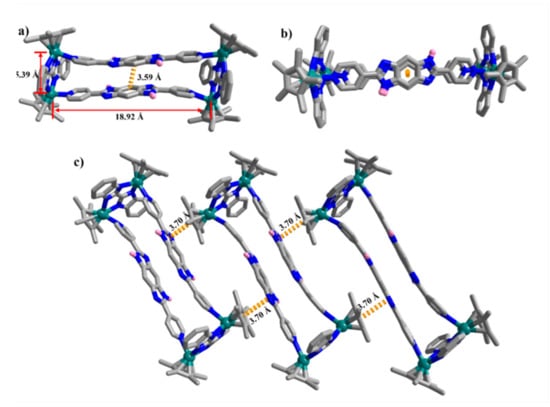 The solid-state structure of complex 2 was also demonstrated by single-crystal X-ray diffraction analysis, which shows a centrosymmetric rectangular macrocyclic compound with four rhodium atoms located at the corners. Here, the short Rh-Rh nonbonding distance is 5.39 Å, which is longer than that in 1 (3.66 Å) due to the larger spacer. The long Rh-Rh nonbonding distance of 18.92 Å is closely comparable to that measured in compound 1. Interestingly, the distance of central conjugated units from two ligands L1 in complex 2 is 3.59 Å, which is even shorter than that in complex 1, reflecting that the central conjugated planes tend to be close to each other for forming π-π stacking interaction (Figure 5). Therefore, the imidazole units in L1 are not coordinated with the rhodium atom, possibly due to the building blocks E1, E2 providing a suitable distance for the central conjugated planes from two L1 ligands, which is more conducive to forming strong π-π stacking interactions from electron delocalization effects of benzimidazole units. In addition, compared to that in compound 1, the intermolecular force is different. Two sets of obvious π-π stacking interactions could be found between Cp* groups and benzimidazole units in complex 2, accompanied by a distance of 3.70 Å. From Figure 5, we could find that each molecular rectangle 2 is able to form four π-π stacking interactions from another two rectangles, resulting in a stable solid structure.