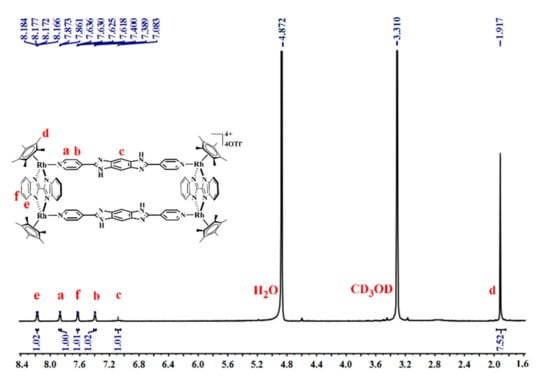 Here, we designed and synthesized a new organic ligand, 2, 6-bis (pyridin-4-yl)-1, 7-dihydrobenzo [1, 2-d: 4, 5-d′] diimidazole (BBI4PY). Meanwhile, three Cp* Rh-based building blocks (Cp* = η5 − C5Me5) bearing different sizes and traits were carefully selected (Scheme 1). Based on a coordination-driven self-assembly strategy, three supramolecular compounds were realized smoothly, including two organometallic macrocycles and a heterometallic cage. In addition, these complexes were determined by single-crystal X-ray diffraction (Supplementary Materials Table S1), elemental analysis (EA), infrared spectroscopy (IR), thermogravimetric analysis (TGA) and ESI-MS.
