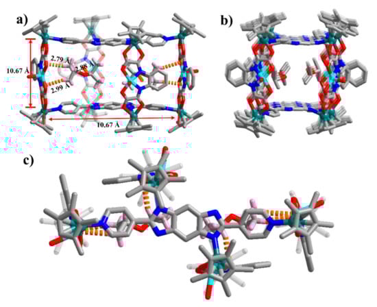 (a) Molecular structure of 3@2iPr2O; (b) side view of 3@2iPr2O; (c) top view of 3@2iPr2O. Triflate anions and solvent molecules outside the framework, as well as hydrogen atoms, are omitted for clarity (N—blue; O—red; C—gray; Cu—cyan; Rh—aqua; H—pink).