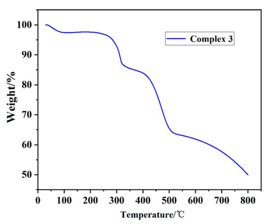 Then, a series of tests, such as UV-vis (Figure 10), TGA and IR spectra were performed carefully to explore the structural characteristic of cage 3@2iPr2O. The TGA test also showed that a significant loss was found in 30–100 °C, reflecting the loss of isopropyl ether and coordinated H2O molecules. Then, when the temperature rose from 100–300 °C, no mass loss was found, showing the structural stability. After that, an obvious weak loss (17.4%) can be observed, which is consistent with the mass of the two ligands L1 (17.1%), suggesting the skeletal collapse of complex 3@2iPr2O (Figure 11). The results also reflect a stronger interaction between the host framework and guest molecules contained in a cage than these free isopropyl ether molecules. The UV-vis in solution and solid state and IR spectrum tests both determined the structure of this complex 3@2iPr2O (Figure 12). The structural analysis of IR spectrum for complex 3@2iPr2O showed a strong band at 3442 cm−1, attributed to the stretching vibration of the N-H bond of imidazole group. Additionally, the stretching vibrations of the OTf− anions appeared at 1278, 1026, and 1159 cm−1, respectively [,,,,]. Additionally, the vibration of aromatic ring of ligand L1 is likely at 1615 and 1421 cm−1 [,,,,]. In addition, a strong signal at 575 cm−1 could be attributed to the Cu-O bonding signal of building block E3. (Figure 12).