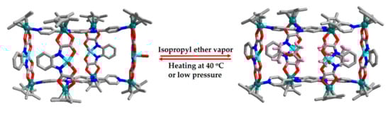 In addition, when the crystals 3@2iPr2O was allowed to vacuum under low pressure for 3h, after that, the isopropyl ether molecules were removed and the cage structure could be maintained integrally, which was demonstrated by the TGA tests (Figure 13). After that, the empty cage 3 was dissolved in a methanol solution. Then, the isopropyl ether solvents were allowed to diffuse into the above solution. After three days, good green crystals were recovered; the crystals could be determined by the single X-ray diffraction analysis, demonstrating the reformation of host–guest cage 3@2iPr2O containing two isopropyl ether molecules. The results reflect that the cage 3@2iPr2O packaging isopropyl ether molecules has cyclicity.