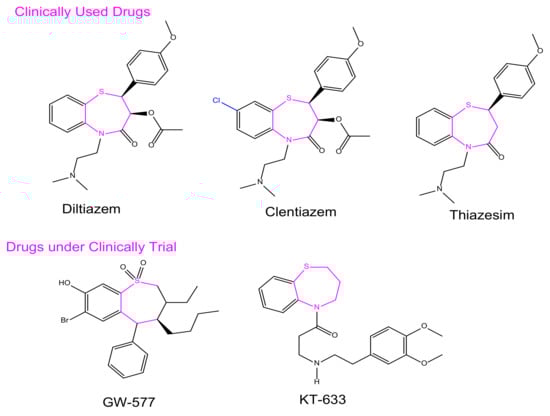 - Bariwal, J.B.; Upadhyay, K.D.; Manvar, A.T.; Trivedi, J.C.; Singh, J.S.; Jain, K.S.; Shah, A.K. 1,5-Benzothiazepine, a versatile pharmacophore: A review. Eur. J. Med. Chem. 2008, 43, 2279–2290. [Google Scholar] [CrossRef] [PubMed]