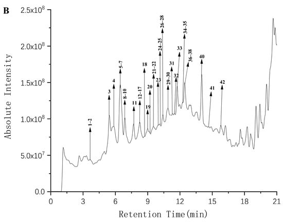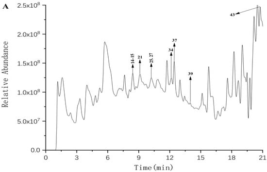 Samples were analyzed on an UPLC system (Agilent 1290) coupled to a Q–TOF mass spectrometer (Agilent 6545, Agilent Technologies, Santa Clara, CA, USA). Compounds were separated over a ZORBAX Eclipse Plus C18 column (2.1 × 100 mm, 1.8 µm) maintained at 40 °C. Aqueous 0.05% acetic acid solution (mobile phase A) and acetonitrile (mobile phase B) were used as mobile phase. Gradient elution optimization was performed as follows: 0 min, 5% B; 2 min, 5% B; 10 min, 30% B; 20 min, 100% B. The flow rate was 0.3 mL/min, the injection volume was 2 μL, and the column temperature was maintained at 40 °C. The conditions for negative electrospray ionization mode were as follows: capillary voltages, 3500 V; nebulizer pressure, 35 psi; nozzle voltage, 1000 V; drying gas flow rate, 6 L/min, drying gas temperature, 300 °C; sheath gas temperature, 350 °C; and sheath gas flow, 11 L/min. Full-scan MS was acquired from m/z 100 to 1000. The isolation window was selected as Medium (m/z~4) and the collision energy range was 0–30 ev.