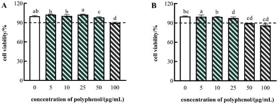 Cell viability of HepG2 cells treated with different concentrations of FF polyphenol (A) and FP polyphenol (B). The data are presented as the mean ± SD (n = 3). Different lowercase letters indicate significance at p < 0.05.