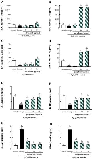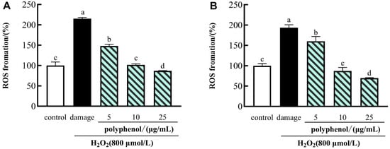 The cellular reactive oxygen species (ROS) levels were determined following a previous report [15] with some modifications. In brief, cells were seeded at a density of 2 × 104 cells/well into 96-well plates, and cultured in a 37 °C, 5% CO2 incubator for 24 h. Then, 100 μL of no-toxic polyphenol extracts at the concentrations of 5, 10, 25 μg/mL was added into each well. Subsequently, 800 μmol/L H2O2 was added and incubated for 6 h. Finally, the cells were washed with PBS, and 10 μmol/L DCFH–DA (0.0125 mg/mL in medium without FBS) was added. The absorbance was determined at 488 (excitation wavelength) and 525 nm (emission wavelength) using a fluorescence enzyme labeler. (BioTek Synergy H1, Burlington, VT, USA).