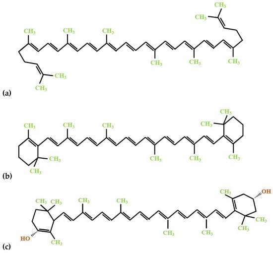 The chemical structure of the significant carotenoid constituents of tomato processing by-products: (a) lycopene; (b) β-carotene; (c) lutein.