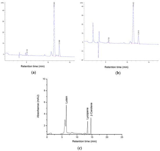 Chromatograms of the tomato by-product extracts using (a) ethyl acetate; (b) using ethyl lactate as solvent; (c) carotenoid standards: lutein Rt = 5.71 min; lycopene Rt = 11.40 min; β-carotene Rt = 12.62 min.