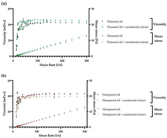 As concluded, the results obtained in the present article are in accordance with similar studies, and the analyzed viscosity between shear stress of 5 to 300 s−1 presented a viscosity between 40 and 50 mPa·s in the case of all three oils. These oils can all be suitably introduced into different food matrices based on the results. Further, the best and the lowest viscosity was obtained with hempseed and flaxseed oil based on edibility. Still, due to diminished viscosity in the case of enriched grapeseed oil, this substrate is also very suitable for consumption, especially after introducing the carotenoid extract.