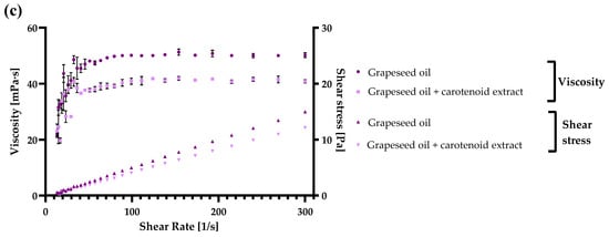 The viscoelastic behavior and shear stress of (a) flaxseed oil, (b) hempseed oil, (c) grapeseed oil, and their enriched variants with carotenoids, obtained with ethyl acetate extraction, were analyzed at 25 °C. Each value is displayed as the mean values of triplicate measurements ± SD (standard deviation); GraphPad Prism Version 8.0.1 (Graph Pad Software, Inc., San Diego, CA, USA).
