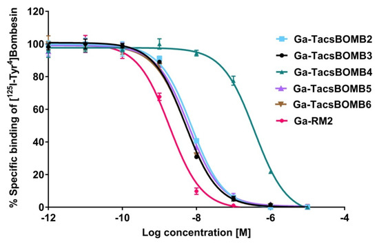 PC-3 cells were seeded at 2 × 105 cells/well in 24-well poly-D-lysine plates 24–48 h prior to the experiment. The growth medium was replaced by 400 μL of reaction medium (RPMI 1640 containing 2 mg/mL BSA and 20 mM HEPES). Cells were incubated for 30–60 min at 37 °C. Ga-TacsBOMB2, Ga-TacsBOMB3, Ga-TacsBOMB4, Ga-TacsBOMB5, Ga-TacsBOMB6, or Ga-RM2 in 50 μL of decreasing concentrations (10 μM to 1 pM) and 50 μL of 0.011 nM [125I-Tyr4]Bombesin (Perkin Elmer, Waltham, MA) were added to wells, followed by incubation with moderate agitation for 1 h at 27 °C. Cells were gently washed with ice-cold PBS twice, harvested by trypsinization, and measured for radioactivity on a Perkin Elmer (Waltham, MA, USA) Wizard2 2480 automatic gamma counter. Data were analyzed using nonlinear regression (one binding site model for competition assay) with GraphPad (San Diego, CA, USA) Prism 8 software.