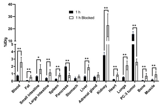 Comparison of [68Ga]Ga-TacsBOMB5 with/without co-injection of nonradioactive standard on the uptake in PC-3 tumor xenografts and major organs/tissues in mice at 1 h post-injection. Error bars indicate standard deviation. * p < 0.05, ** p < 0.01.