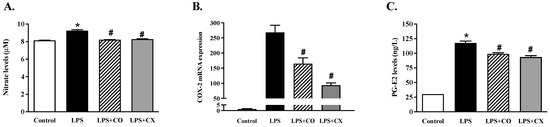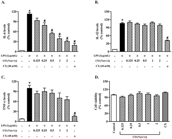 The cells were stimulated with LPS at 1 μg/mL and then treated with 2% CO or 10 μM of CX. The cells were subjected to 20 min centrifugation at 4 °C with a speed of 10,000× g. A commercial kit was used to measure the level of nitric oxide (NO) in the supernatant (Cayman Chemical, Ann Arbor, MI, USA). The NO concentration was evaluated at 540 nm (BioTek, Winooski, VT, USA).