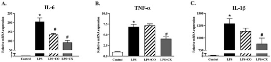 The effects of CO on the gene expression of proinflammatory cytokines. LPS-activated RAW 264.7 cells were incubated with CO for 24 h and the inflammatory cytokine gene expression was measured. During the 24 h of experiments, cells were given either 2% CO or 10 µM CX with or without LPS. qPCR was used for the gene expression of IL-6, IL-1β, and TNF-α (A–C). Values displayed are mean ± S.E.M (n = 5), * p < 0.05 vs. control and # p < 0.05 vs. LPS.