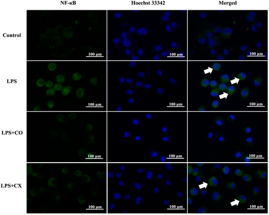 The influence of CO on NF-κB p65 activation was determined using fluorescence staining. According to the results presented in Figure 4, LPS-induced inflammation cells elevated the NF-κB p65 activation; however, this activation was prevented in the CO-treated group. Furthermore, CX also reduced NF-κB p65 activity in cells induced with LPS. These findings imply that CO’s anti-inflammatory properties may be attributable to its ability to suppress the NF-κB pathway.