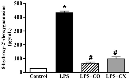 The DNA damage marker 8-hydroxy-2′-deoxyguanosine (8-OHdG) was studied using ELISA. One μg/mL LPS with or without CO or CX was added to the cells for 24 h at 37 °C on the day of the experiment. Subsequently, the cells were centrifuged at 10,000× g for 20 min at 4 °C. The 8-OHdG concentration was assessed using a SynergyTM HT microplate reader with a 450 nm wavelength (BioTek, Winooski, VT, USA).