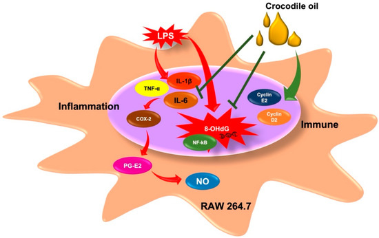 The freshwater crocodile, Crocodylus siamensis, is found in Southeast Asia and it is the world’s most endangered crocodilian species. Thailand’s Department of Fisheries has promoted crocodile breeding to increase exports while encouraging conservation. Commercial crocodile breeding occurs in Thailand, where at least one million reptiles are raised. Heavy metals, radiation, and pathogenic microorganisms are no match for a crocodile’s resistance to these threats to its health. Earlier studies have shown that the lysates of several organs from the crocodile’s body (heart, lungs, liver, brain intestines, bile, and gallbladder) have antibacterial anti-tumor effects [1], with antibacterial and wound-healing qualities features of crocodile blood [2]. Crocodile oil (CO) was shown to be effective in the treatment of asthma, emphysema, flu, persistent cough, phlegm-producing mucus, skin ulcers, burns, cancer, and wounds [3,4,5]. Moreover, in traditional remedies, such as traditional Chinese and Southeast Asian medicine, CO and its derivatives are used as ointments for treating burns and scalds [6,7]. Other cosmetic goods made from CO include oils, pain relievers (such as pain-relief balm), and skin lotions. Our previous studies found that omega-9 fatty acid rich in fish oil exerts antidiabetic and anti-inflammatory effects in type 2 diabetic rats and RAW 264.7 models, respectively [8,9]. Despite this, the mechanisms through which CO has anti-inflammatory and immunomodulatory effects are still a mystery.