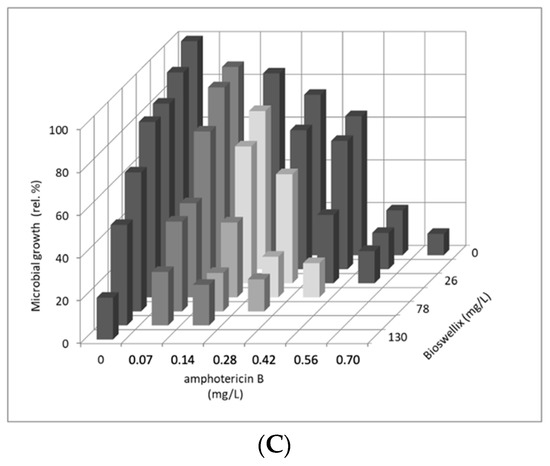 Effect of erythromycin or polymyxin B in combination with boswellic acids extract on suspension growth of (A) S. epidermidis ATCC 14990, (B) E. faecalis ATCC 29212, and (C) E. coli CCM 3954. x- and z-axes depict fractions of MIC80 of respective compound. y-axis depicts microbial growth of suspension cells in relative percentages (control represents 100%).