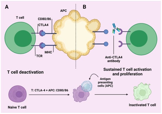 T cell deactivation (A) and T cell activation and proliferation (B). One (same antigen given through an APC) and signal two: CD-28 interacting with CD 80 or 86, energize the T cell in the lymph node, so that it can help to increase cell numbers and help the activities of T cells [56]. Activities enhance the evolution of the t cytotoxic surface size of the cell, which is related to CLA4. This can combine with CD 80 or 86 rather than 28. These activities are in advance of the checkpoint and are responsible for inactivating the T cell. This middle checkpoint is refused by anti CTLA-4 and the ambit for t cell delegation falls, growing T cell operation [55].