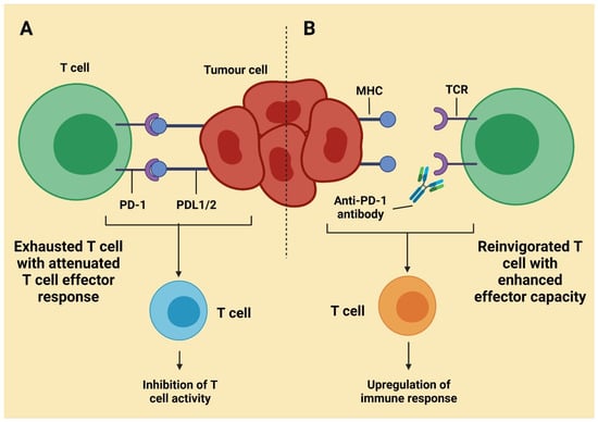 Inhibition of T cell activity (A) and upregulation of the immune response (B). Activity of CTLA-4 is generally in the tissue of lymph nodes, which are secondary; PD-1 is manifested into T cells, transported from the lymph side, and works on the tumor cell. These cells are peripheral tissue. PD-1 interacts with apoptosis ligand one, found in many tissues, and PD-L2 is is limited for allergen containing cells [58].