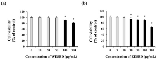 NIH-3T3 skin fibroblast cells were purchased from the Korean Type Culture Collection (KTCC, Seoul, Korea). The cells were cultured in Dulbecco’s Modified Eagle’s Medium (DMEM) (HyClone, Logan, UT, USA) containing 10% (w/v) fetal bovine serum (Coring Company, Corning, NY, USA), 100 units/mL of penicillin, and 100 μg/mL of streptomycin. To assay the cytotoxicity of WESBD and EESBD, 1 × 104 NIH-3T3 cells were seeded in each well of a 96-well flat-bottomed plate and incubated for 24 h at 37 °C in a CO2 incubator. The culture medium was then replaced with serum-free DMEM containing various concentrations of WESBD or EESBD (range: 0−300 μg/mL). After incubation for another 24 h, cell viability was estimated using WST-1 solution (Dozen, Seoul, Korea) according to the manufacturer’s protocols. The absorbance was evaluated at 450 nm using a microplate reader (iMark Microplate Reader; Bio-Rad Laboratories, Inc., Hercules, CA, USA).