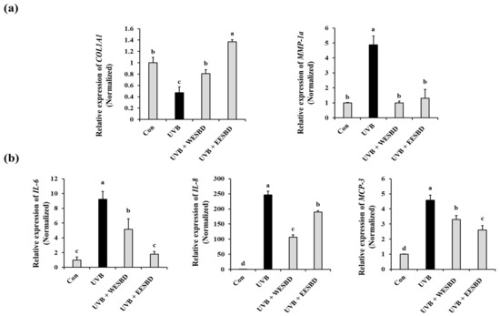 As repeat UVB exposure can induce inflammation and skin damage, attenuation of UVB-induced inflammatory responses has been recognized as an important way to maintain skin health. Proinflammatory cytokines, such as IL-6, IL-8, and MCP-3 are known to be key regulators of subcutaneous fat loss induced by UVB irradiation. Therefore, these cytokines are primary targets in the development of antiphotoaging agents. In this study, the expression of proinflammatory cytokines (IL-6, IL-8, and MCP-3) was upregulated in the UVB-irradiated NIH-3T3 cells and downregulated in the cells pretreated with non-toxicological levels of WESBD or EESBD (Figure 2b) (p < 0.05). These results suggest that both WESBD and EESBD may have potential as antiphotoaging agents by suppressing the UVB-induced increase in proinflammatory cytokines (IL-6, IL-8, and MCP-3).