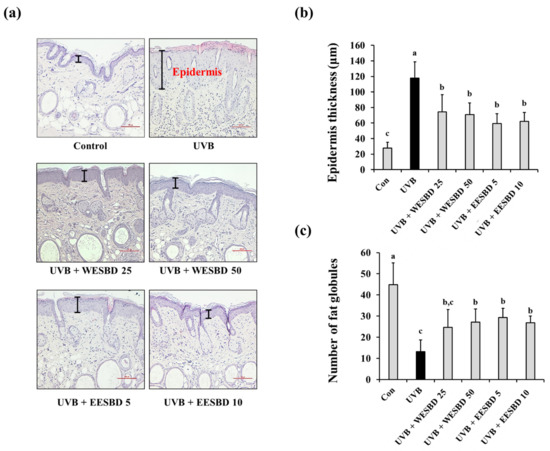 To further investigate the antiphotoaging activities of WESBD and EESBD, we examined their effects on UVB-induced changes in wrinkles and epidermal thickness of hairless mice. As shown in Figure 3, the number of skin wrinkles in the UVB group was markedly increased as compared with that in the control group. In contrast, the number of skin wrinkles in the WESBD- and EESBD-treated groups was significantly decreased as compared with that in the UVB group. Moreover, the epidermal thickness in the UVB group was markedly increased as compared with that in the control group (p < 0.05). As compared with the UVB group, the epidermal thickness was markedly decreased in the WESBD- and EESBD-treated groups (p < 0.05) (Figure 4a,b). Furthermore, epidermal fat loss induced by UVB irradiation, which is an indicator of photoaging, was not evident in the WESBD- and EESBD-treated groups (Figure 4a,c). Collectively, these results suggest that both WESBD and EESBD have antiphotoaging effects by ameliorating photoaging processes, such as wrinkle formation, epidermal thickening, and epidermal fat loss, induced by UVB.