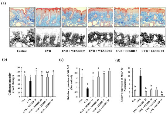 As shown in Figure 2, the WESBD and EESBD treatments restored the expression of COL1A1 and MMP-1a in NIH-3T3 skin fibroblast cells (Figure 2). We confirmed the effects of both WESBD and EESBD on the collagen content of UVB-irradiated murine skin. As shown in Figure 5a,b, the dermal collagen content was significantly decreased in the UVB group as compared with that in the control group (p < 0.05). In contrast, as shown Masson’s trichrome staining, the collagen content was restored in the WESBD- and EESBD-treated groups (p < 0.05). In addition, COL1A1 and MMP-1a expression were restored in the skin of the WESBD- and EESBD-treated groups (p < 0.05) (Figure 5c,d). These data strongly suggest that restoration of the collagen content of UVB-irradiated murine skin by WESBD or EESBD could be via the treatments’ effects on the expression of COL1A1 and MMP-1a, both of which are closely linked to skin collagen synthesis and degradation.