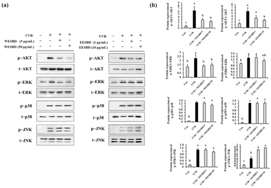 Ultraviolet B (UVB)-induced over-phosphorylation of protein kinase B (AKT) was suppressed by pretreatment with water extract of S. barbata D. Don (WESBD) or ethanol extract of SBD (EESBD). NIH-3T3 cells were pretreated with WESBD or EESBD, and the effects of UVB irradiation on AKT and mitogen-activated protein kinase (MAPK) phosphorylation were determined by Western blotting (a). The density of each band was calculated using the ImageJ program and tabulated (b). The experiments were repeated three times, with similar results. A representative result is shown. Data are presented as the mean ± SD. Different letters indicate a significant difference between groups (p < 0.05).