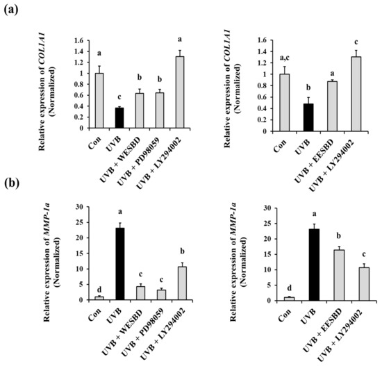 To investigate the intracellular regulator that controls the antiphotoaging properties of WESBD and EESBD, we examined the effects of WESBD and EESBD on UVB-induced phosphorylation of AKT and MAPKs in NIH 3T3 cells by Western blotting. As presented in Figure 6a,b, the WESBD and EESBD treatments significantly reduced abnormal phosphorylation of AKT induced by UVB (p < 0.05). Although the WESBD treatment attenuated UVB-induced over-phosphorylation of ERK in the NIH 3T3 cells, it did not reduce abnormal phosphorylation of other MAPKS, such as p38 and JN, induced by UVB irradiation. In addition, the EESBD treatment did not inhibit abnormal phosphorylation of ERK, p38, and JNK induced by UVB irradiation. To shed further light on the efficacy of both WESBD and EESBD in inhibiting UVB-mediated photoaging processes, we compared COL1A1 and MMP-1a expression in groups treated with different concentrations of WESBD and EESBD and ERK and AKT inhibitors. As depicted in Figure 7, the ability of WESBD at a concentration of 50 µg/mL to restore normal COL1A1 and MMP-1a expression in the UVB-irradiated group was equivalent to that of the ERK inhibitor (10 µg/mL, PD98059). However, non-toxicological levels of WESBD (50 µg/mL) and EESBD (10 µg/mL) were less effective than the AKT inhibitor (10 µg/mL, LY294002) in restoring normal COL1A1 and MMP-1a expression in the UVB irradiated group. Taken together, these results suggest that the antiphotoaging activity of WESBD and EESBD in terms of combatting UVB exposure involves inhibition of phosphorylation of AKT.