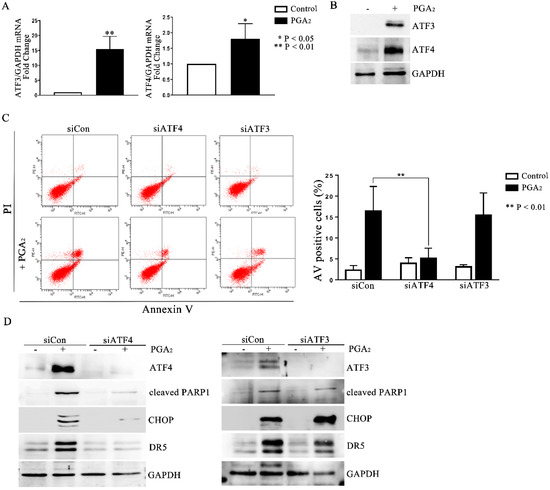 Activating transcription factor (ATF) 3 and ATF4 are stress-responsive proteins that can conduce CHOP transcription in response to various stimuli. Moreover, it was reported that ATF4-ATF3-CHOP cascade induced apoptosis in human pulmonary cancer and leukemia cells [19,20]. Thus, to identify the upstream regulators of CHOP, we analyzed the expression of ATF3 and ATF4. As shown in Figure 4A,B, PGA2 increased the expression of ATF3 and 4 at the levels of mRNA and protein, implying the ATF3 and 4-mediated expression of CHOP and DR5. Although PGA2 increased the expression of ATF3 with a parallel level to that of ATF4, only knockdown of ATF4 inhibited the induction of apoptosis (Figure 4C and Figure S7). Furthermore, ATF4 siRNA suppressed the PGA2-induced increase of CHOP and DR5 proteins (Figure 4D), whereas ATF3 siRNA did not affect it. Collectively, therefore, it can be concluded that PGA2 induces apoptosis by activating the ATF4-DR5-CHOP pathway.