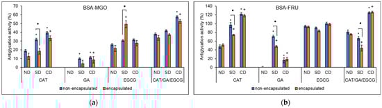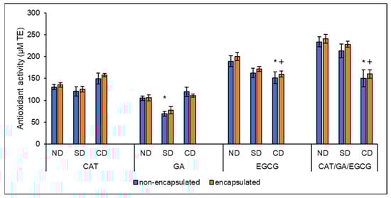 | CAT/GA/EGCG | non-encapsulated | 100 ± 0.56 b | 104.77 ± 0.68 a | 93.22 ± 0.97 c |