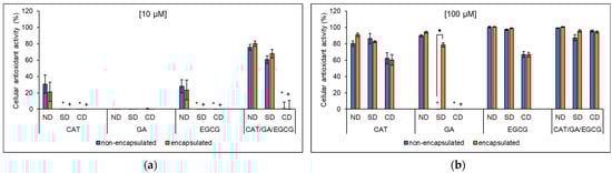 | EGCG | non-encapsulated | 100 ± 0.60 a | 98.06 ± 1.73 a | 77.50 ± 0.62 b |