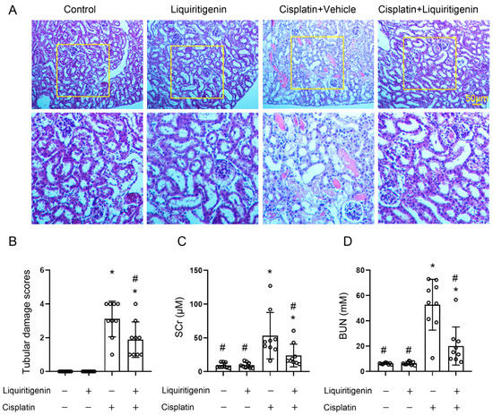 The effect of liquiritigenin on AKI induced by CP in mice. (A) Representative micrographs of HE staining in the kidney from different groups of mice. (B) Quantitative pathological assessment of tubular damage from different groups of mice. Renal morphology was scored according to the proportion of damaged renal tubules, such as brush border, tubule dilatation, and cast formation in the total renal tubules. The scoring criteria were as follows: 0, normal; 1, <10%; 2, 10~25%; 3, 26~50%; 4, 51~75% and 5, >75%. * p < 0.05 vs. control group of mice, # p < 0.05 vs. mice with CP treatment (n = 9 mice/group). (C) Serum creatinine levels of mice in different groups. * p < 0.05 vs. control group of mice, # p < 0.05 vs. mice with CP treatment (n = 9 mice/group). (D) Blood urea nitrogen levels of mice in different groups. * p < 0.05 vs. control group of mice, # p < 0.05 vs. mice with CP treatment (n = 9 mice/group).