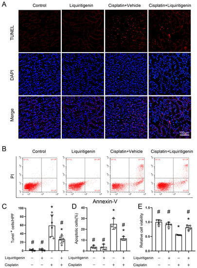 It is well known that apoptosis of renal tubule epithelial cells is a key feature of the pathogenicity associated with AKI. In this study, cell apoptosis was examined by TdT-mediated dUTP nick-end labeling (TUNEL) staining in vivo (Figure 2A,C) and by flow cytometry with Annexin V-FITC and propidium iodide (PI) staining in vitro (Figure 2B,D). Liquiritigenin was found to substantially decrease the number of apoptotic renal tubule epithelial cells compared with the CP treatment group. The result was further confirmed with cell viability rates by MTT cell viability assay (Figure 2E).
