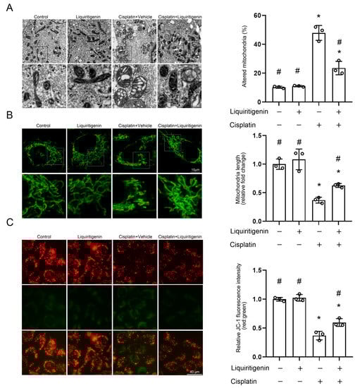 The effect of liquiritigenin on CP-induced mitochondrial damage. (A) Representative TEM images on the left showing mitochondrial morphology and mitochondria diameter of live cultured renal tubule epithelial cells with different treatments. Quantitative assessment of the percentage of altered mitochondria characterized by mitochondria swelling, vacuolization, and cristae fragmentation. * p < 0.05 vs. vehicle-control group, # p < 0.05 vs. CP treatment group. Data were obtained from three independent biological replicates. (B) Representative images for MitoTracker greens staining showing mitochondrial morphology and mitochondria length in live cultured renal tubule epithelial cells with different treatments. The results were normalized to the mitochondrial length of the vehicle-control group. * p < 0.05 vs. vehicle-control group, # p < 0.05 vs. CP treatment group. Data were obtained from three independent biological replicates. (C) Representative images of renal tubule epithelial cells stained with JC-1 showing changes in fluorescence intensity in live cultured renal tubule epithelial cells with different treatments. JC-1 fluorescence was normalized to the red-to-green ratio of the vehicle-control group. * p < 0.05 vs. vehicle-control group, # p < 0.05 vs. CP treatment group. Data were obtained from three independent biological replicates.