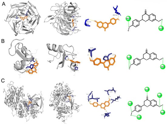 The molecular docking study of liquiritigenin was performed by AutodockTools 1.5.6, and the crystal structures of docking molecules were obtained from the Protein Data Bank (https://www.rcsb.org/ (access on 14 October 2021)). The docking results were optimized using Pymol software. The values of CDocker energy were used as evaluation criteria.