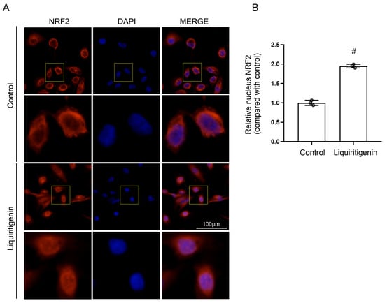 The effect of liquiritigenin on the nuclear translocation of NRF2. (A) Subcellular location of NRF2 determined by immunofluorescence microscopy in live cultured renal tubule epithelial cells with liquiritigenin treatment. Nuclei were revealed using 4′,6-diamidino-2-phenylindole staining (DAPI). (B) Quantification of nucleus NRF2 fluorescence density. The results were normalized to the ratio of the nucleus NRF2 of vehicle-control. # p < 0.05 vs. the vehicle-control group. Data were obtained from three independent biological replicates.