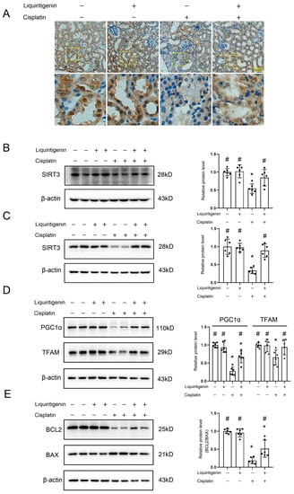 The effect of liquiritigenin on the protein levels through NRF2-SIRT3 signaling. (A) Representative photomicrographs of SIRT3 immunohistochemical staining in the kidneys from different groups of mice. (B) Representative Western blot gel documents and summarizes the data showing the levels of SIRT3 in the kidney from different groups of mice (n = 6 mice/group). * p < 0.05 vs. control group of mice, # p < 0.05 vs. mice with CP treatment. (C) Representative Western blot gel documents and summarized data show the levels of SIRT3 in live cultured renal tubule epithelial cells with different treatments. * p < 0.05 vs. control group, # p < 0.05 vs. CP treatment group. Data were obtained from six independent biological replicates. (D) Representative western blot gel documents and summarized data showing the levels of PGC-1α and TFAM in live cultured renal tubule epithelial cells with different treatments. * p < 0.05 vs. control group, # p < 0.05 vs. CP treatment group. Data were from six independent biological replicates. (E) Representative Western blot gel documents and summarized data showing the levels of BCL2 and BAX in live cultured renal tubule epithelial cells with different treatments. * p < 0.05 vs. control group, # p < 0.05 vs. CP treatment group. Data were obtained from six independent biological replicates.