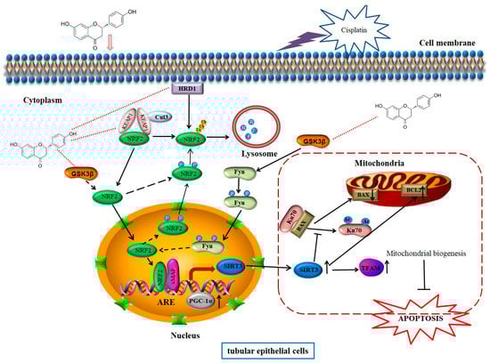 Schematic representation showing the possible mechanisms underlying the protective effect of liquiritigenin against CP-induced AKI. Under pathological conditions, CP leads to mitochondria dysfunction, which contributes to the impaired renal tubule epithelial cells and kidney injury. Firstly, liquiritigenin activates NRF2 by binding to KEAP1, GSK-3β, and HRD1, which can directly inhibit the nuclear translocation and promote the degradation of NRF2 in multiple ways. Subsequently, NRF2 promotes the transcription of SIRT3. In the cytoplasm, SIRT3 deacetylates Ku70, inhibiting the mitochondrial translocation of BAX. Meanwhile, SIRT3 mediates the increased protein level of BCL2. Furthermore, liquiritigenin increases the expression of PGC-1α, which upregulates the SIRT3/TFAM pathway. Eventually, mitochondrial biogenesis is promoted and cell apoptosis is inhibited.