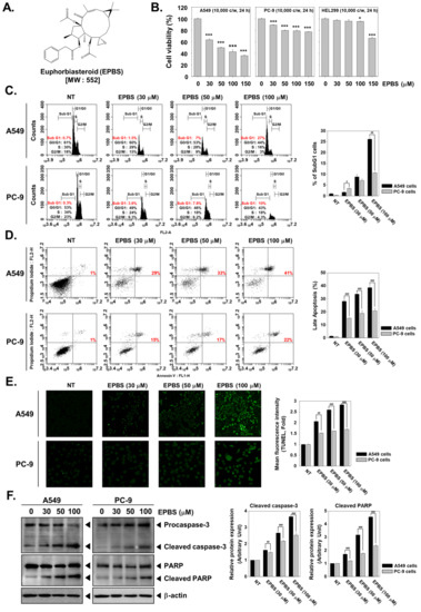 During apoptosis, caspase-3 gets activated, which results in the activation of caspase-dependent DNases, which in turn fragment the genomic DNA into oligonucleotides [44,45]. The cells with decreased DNA are termed hypodiploid cells which are detected as SubG1 cells in flow cytometric analysis. We performed flow cytometric analysis to examine the effect of EPBS on the cell-cycle distribution of A549 and PC-9 cells. There was an increase in the subG1 population (0.7%, 1.5%, 7%, and 27%) of A549 cells at different concentrations of EPBS (0, 30, 50, and 100 µM), respectively, indicating that cancer cells are driven to death after treatment with EPBS (Figure 1C). However, PC-9 cells responded feebly to EPBS treatment.