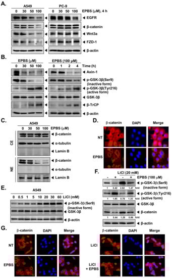 EPBS downregulates EGFR and the Wnt/β-catenin pathway and decreases the nuclear pool of β-catenin. (A) A549 cells and PC-9 cells (5 × 105 cells/well) were treated with EPBS (0, 30, 50, and 100 µM) for 4 h. Western blot analysis was performed. For confirming equal protein loading, the same blot membrane was stripped and re-probed with a β-actin antibody. (B) A549 cells (5 × 105 cells/well) were treated with the indicated concentration of EPBS for 4 h or with 100 µM of EPBS for indicated time intervals. EPBS-treated cells were collected and lysed, and then an equal amount of lysates were detected by Western blot analysis. (C) EPBS (0, 30, 50, and 100 µM for 4 h)-treated A549 cells (5 × 105 cells/well) were collected, and then cytoplasmic extracts (CE) and nuclear extracts (NE) were prepared. As loading control of cytoplasmic extracts or nuclear extracts, α-tubulin or lamin B antibodies were used. (D) A549 cells were treated with EPBS (100 µM) for 4 h, and β-catenin translocation was analyzed by immunocytochemistry. (E) A549 cells were treated with the indicated concentration of LiCl (inhibitor of GSK-3β) for 4 h, and then Western blotting was carried out. (F,G) A549 cells were treated with 20 mM of LiCl and 100 µM of EPBS for 4 h. Then, Western blot analysis and immunocytochemistry were performed. The fold values at the bottom of the blots indicate the fold activation for the untreated control group. Representative data of at least three independent experiments are shown.