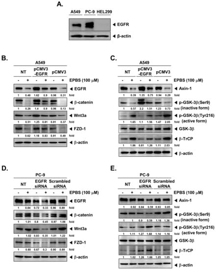 EPBS mitigates the Wnt/β-catenin signaling pathway in EGFR−overexpressing or EGFR−knockdown NSCLC cells. (A) Human NSCLC A549 and PC-9 cells and human normal lung HEL299 cells were seeded on six-well plates (5 × 105 cells/well), and then cells were harvested and lysed. Western blot analysis was carried out. (B,C) A549 cells were seeded on 24-well plates (8 × 104 cells/well). A549 cells were transfected with 300 ng of human EGFR/HER1 gene ORF cDNA clone expression plasmid (pCMV3-EGFR) or pCMV3-untagged negative control vector (pCMV3) with transfection reagent in serum-free medium (SFM) for 24 h. After 24 h, the transfected A549 cells were changed with a complete medium and then treated with 100 μM of EPBS for 4 h. Western Blot analysis was performed. (D,E) PC-9 cells were seeded on 24-well plates (8 × 104 cells/well) overnight and were transfected with 100 nM of EGFR siRNA or scrambled siRNA transfection reagent in a serum-free medium for 36 h. The transfected PC-9 cells were treated with 100 µM of EPBS in a completed medium. After 4 h, the cells were harvested and lysed, and then Western Blot analysis was performed. The fold numbers at the bottom of the blots indicate fold activation for the nontreated control group. All experiments were performed at least three times, and representative data are shown.
