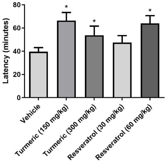 Latency to first generalized seizure (IV/V) after pilocarpine injection. The 300 mg/kg of turmeric and 60 mg/kg of resveratrol groups prolonged the latency to the first generalized seizure compared to the vehicle group. Data were analyzed by one-way ANOVA and Tukey’s post-hoc test. Data are expressed as the mean ± standard error. * p < 0.05 vs. the vehicle group.